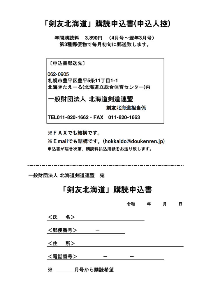 剣友北海道「申し込みフォーム」 各必須項目にご入力の上、「チェックボックス」にチェックをし「送信ボタン」を押して下さい。 ※申込み受信後に「希望の○月号」と「購読料の払込取扱票(ゆうちょ銀行)」を郵送させて頂きます。定期購読料(1年間・毎年4月更新) 3,890円(税込、送料込み)、一部325円(税込、送料111円)、年間購読の剣友北海道は毎月月末の発送となります。 お名前 (必須) 所属剣道連盟または所属団体 (任意) メールアドレス (必須) 郵便番号 (必須) ご住所 (必須) 電話番号 (必須) 何月から購読希望ですか? 下記よりお選びください。(必須) 年間購読を希望1月号のみ希望2月号のみ希望3月号のみ希望4月号のみ希望5月号のみ希望6月号のみ希望7月号のみ希望8月号のみ希望9月号のみ希望10月号のみ希望11月号のみ希望12月号のみ希望 チェックの上、送信ボタンを押して下さい。 上記内容を確認しました。 Δ ※Faxでお申し込みをご希望の方は下の申し込み用紙をご利用ください。