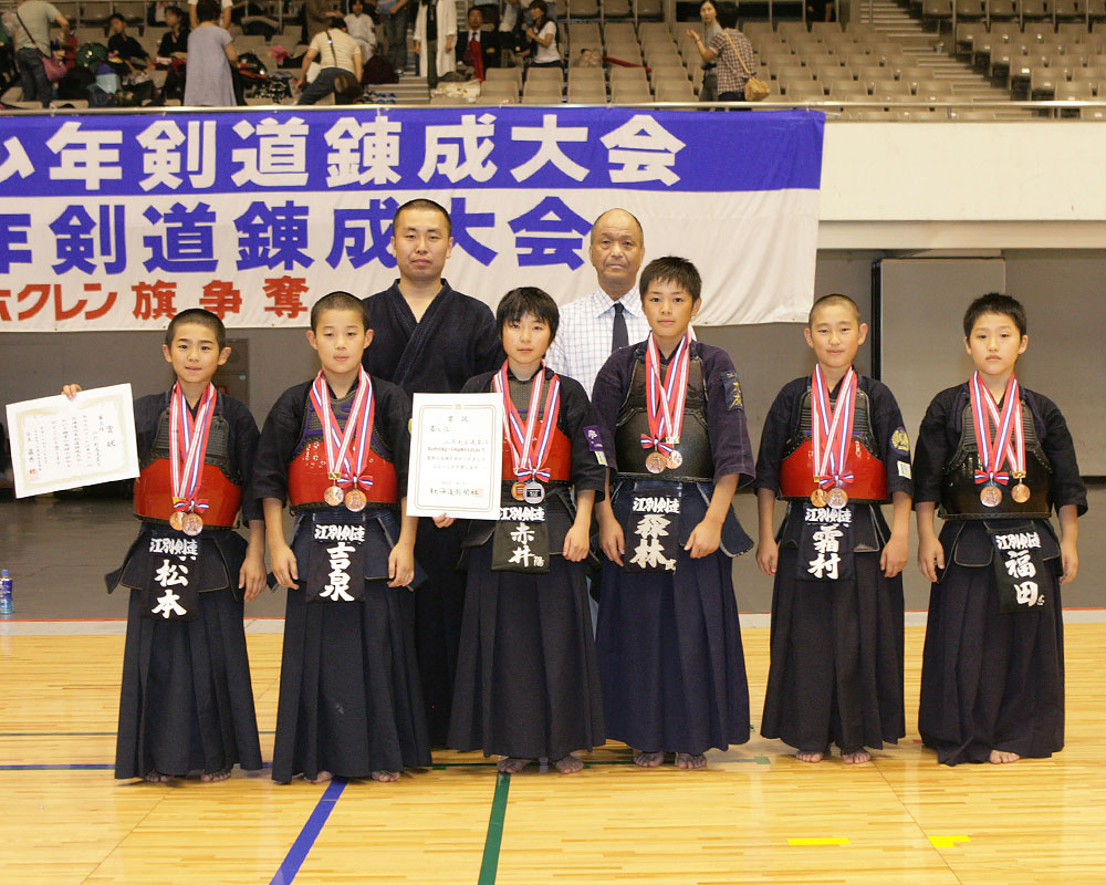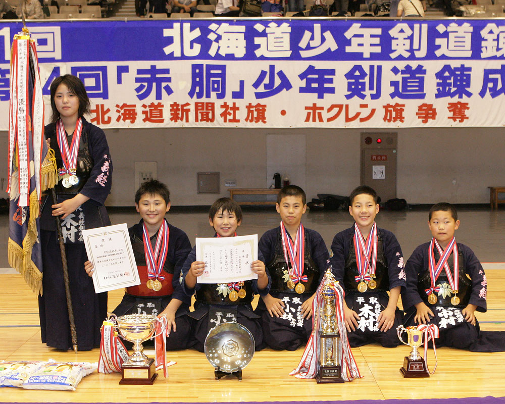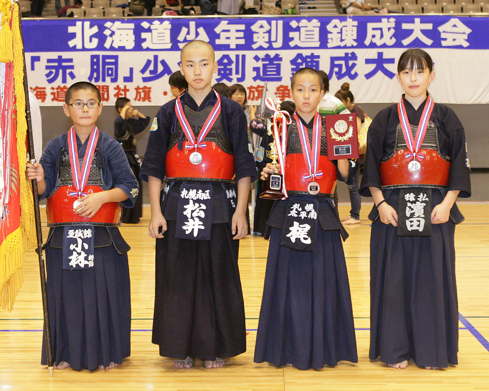 クリックすると大きな 画像でご覧頂けます。 北海道少年剣道錬成大会 優勝 平取義経剣心会(平取) 準優勝 真駒内少年剣道会 A (札幌南区) 第三位 苫小牧至誠館(苫小牧) 第三位 江別剣道連盟 A (江別) 「赤胴」少年剣道錬成大会 優勝・準優勝・第三位