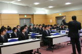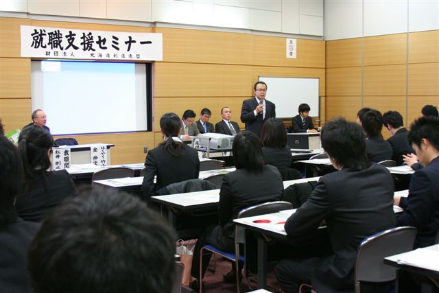 等々について、そのポイントや留意点を詳しく説明。 その後は各業界で活躍している先輩から、所属している会社や官公庁等についての職場実態や就職状況等について説明。さらに、受講者が希望する業界毎に分かれて個別に面談してその職場の実態など詳しい内容を聞いたり、質問したりした。