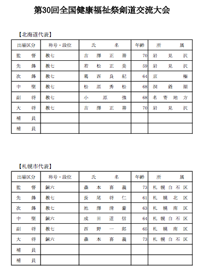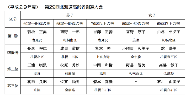 6月11日(日)、北海道立総合体育センター(サブアリーナ)において、全道各地より97名の参加による第29回北海道高齢者大会(兼 第30回全国健康福祉祭剣道交流大会選手選考会)が開催された。大会結果ならびに代表選手は次のとおり。